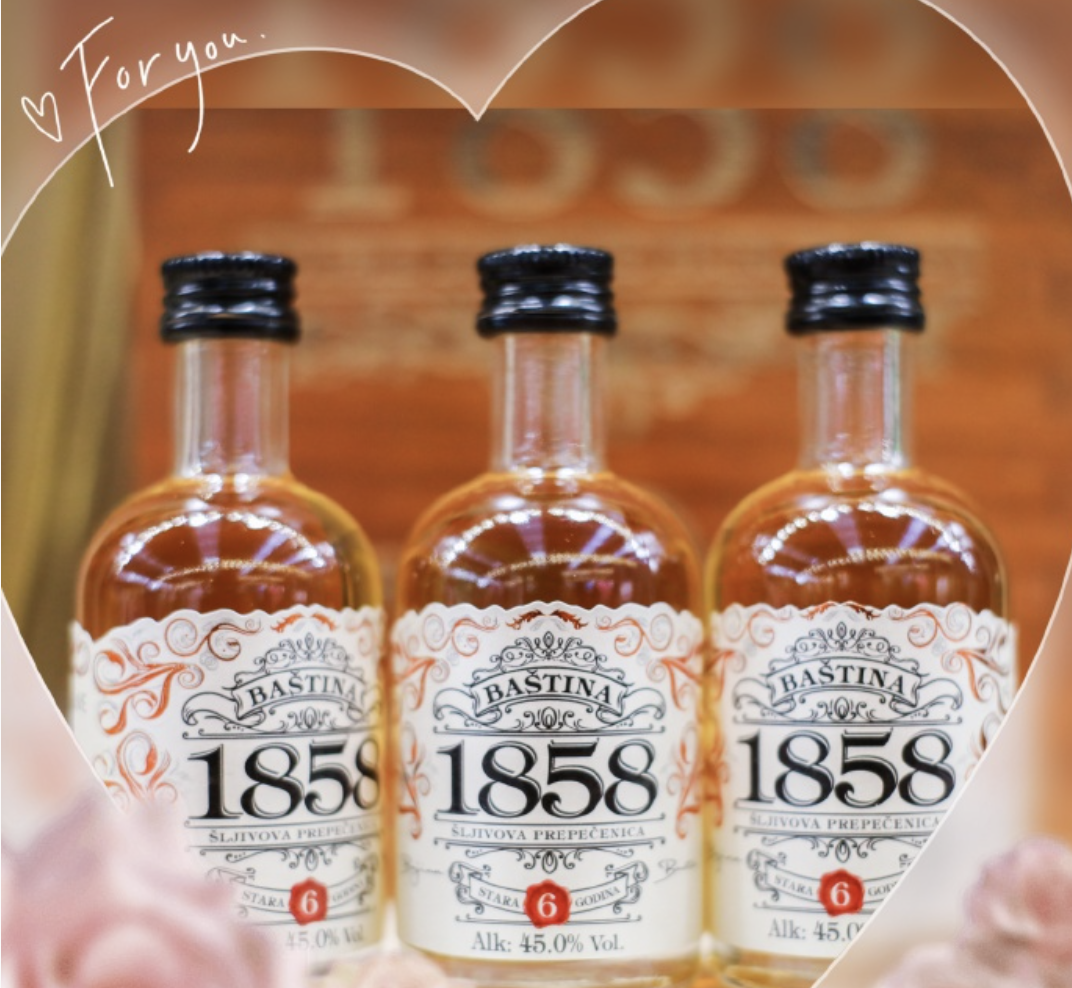 它用精心挑选的来自塔拉山的本地西梅,然后从发酵的果酱里两次蒸馏,再放置在500升高品质橡木桶陈年6年,并且要最好的蒸馏酒液才可以被选来酿制“Baština 1858”。
